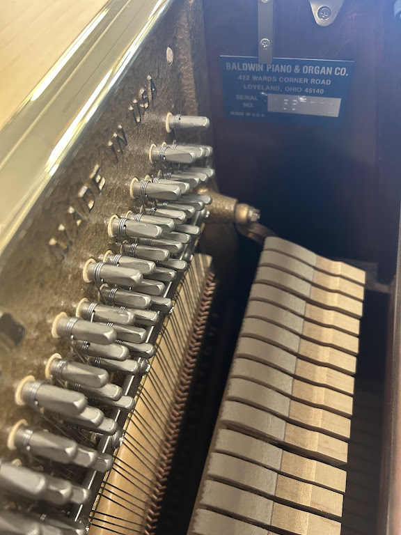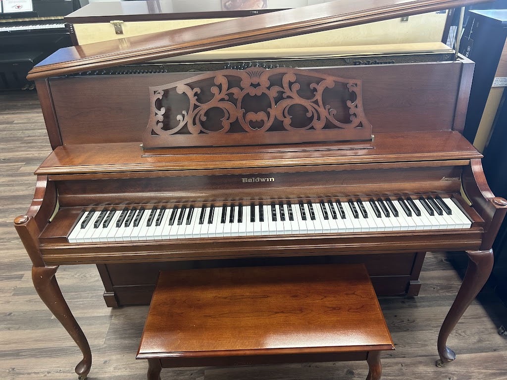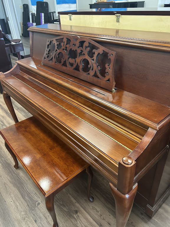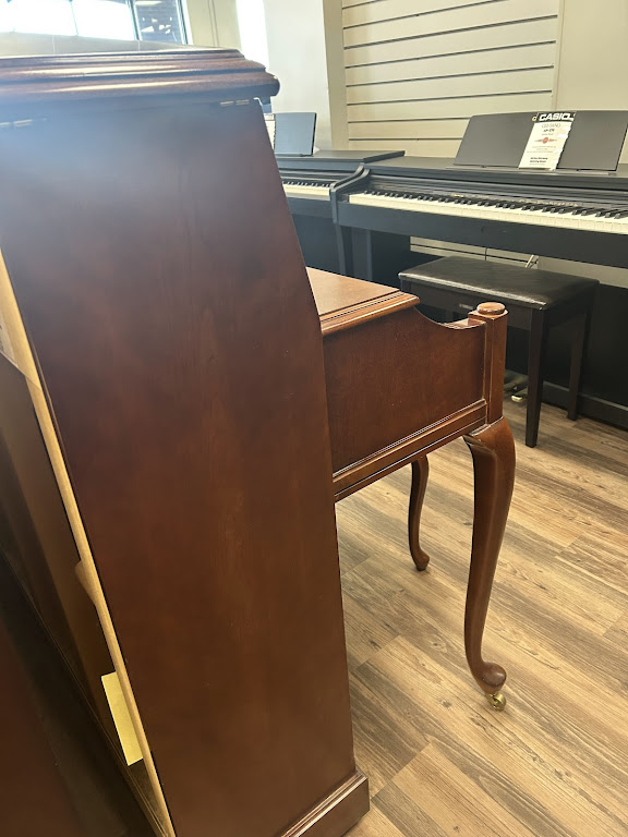 This Baldwin console piano is from the top-of-the-line “Acrosonic” collection of quality-made Baldwin instruments. Features include a 19-ply hard rock maple pin-block for added tuning stability, a solid spruce soundboard for added power and sustain, and the exclusive Baldwin “full-blow” action with larger parts for faster repetition and better dynamic control. Added elegance is enhanced by the hand-carved music rack, grand-style fallboard and tilt lid with stick.
