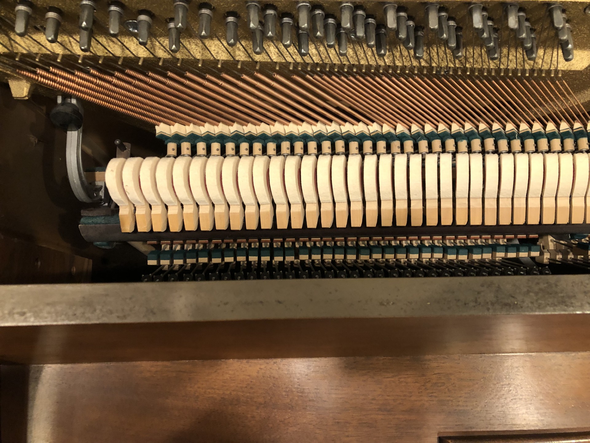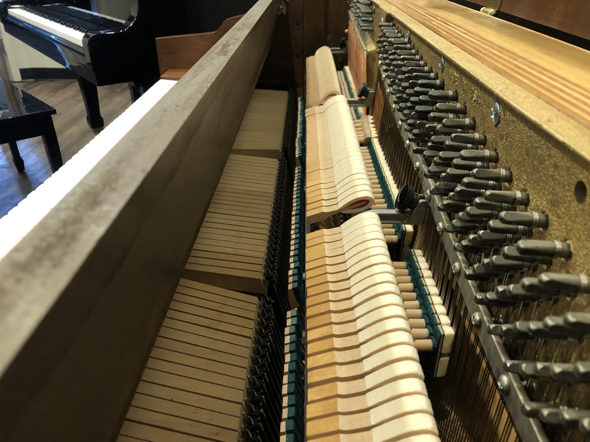 Our store preparation includes removal of all keys to clean the key bed, cleaning and sterilizing the key-tops, vacuuming the inside cavity and back of the instrument, tuning to A-440, action regulation and cabinet detailing.