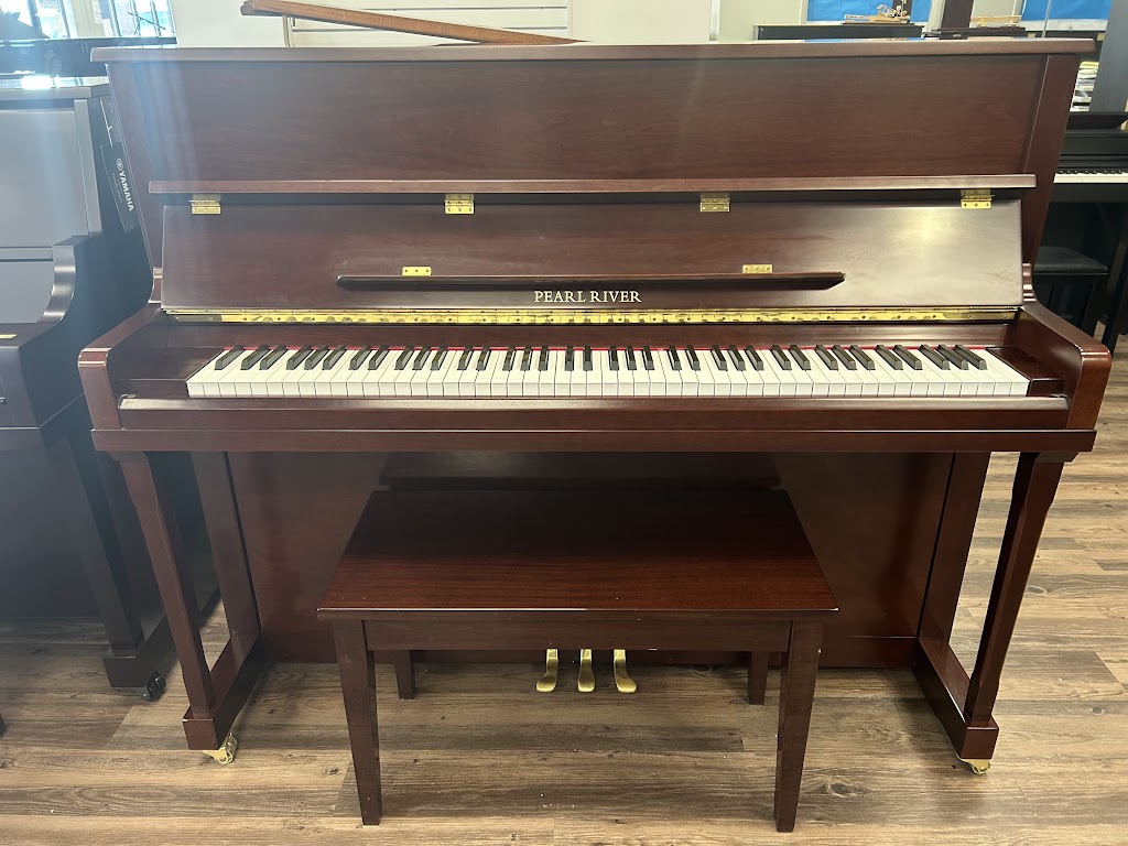 If you are seeking a 48” tall upright piano, then you must consider this gorgeous Pearl River model EU-122 satin mahogany upright piano. It is now available from our Menchey Music – Lancaster piano gallery. Purchased new in year 2014, this lovely, like-new 48” upright is from a local, one-owner, smoke-free residence.
