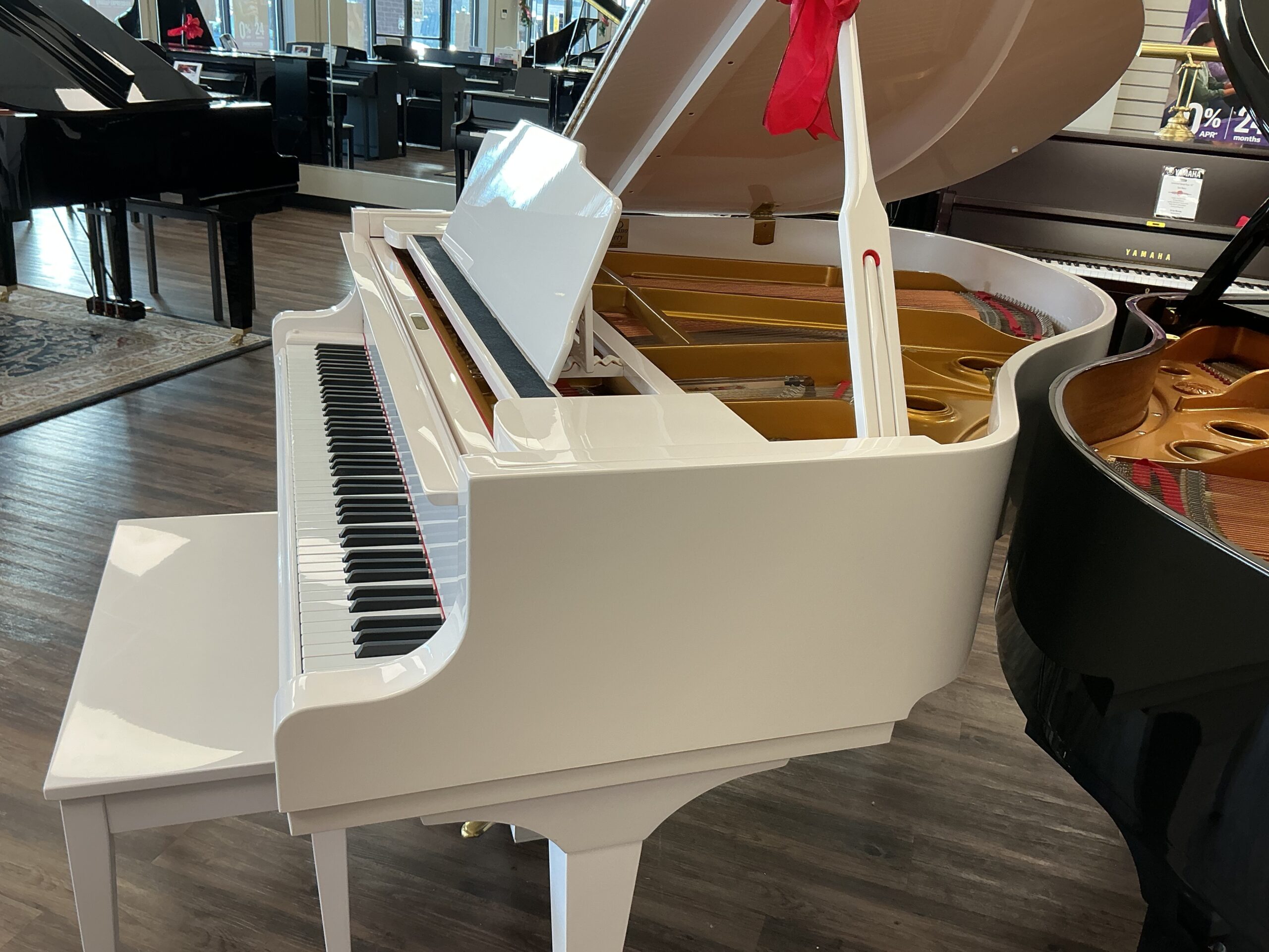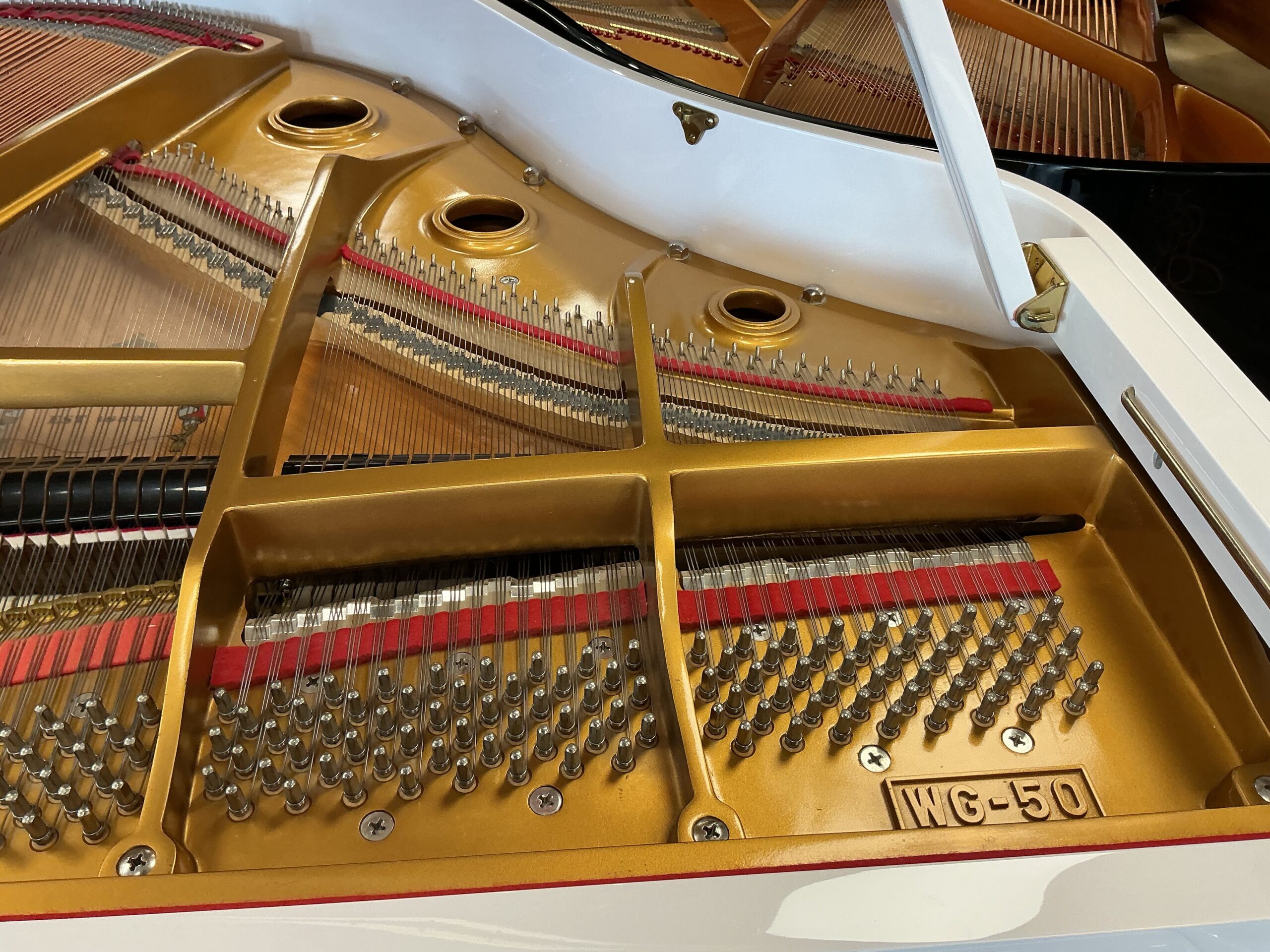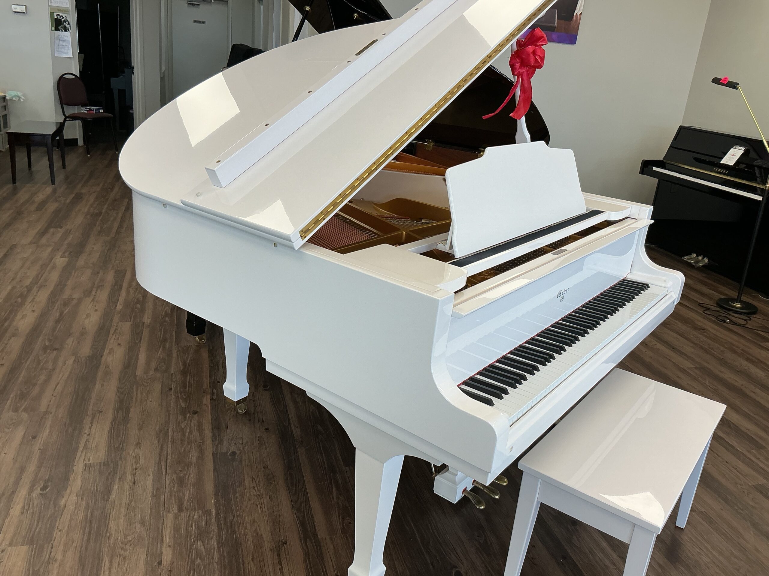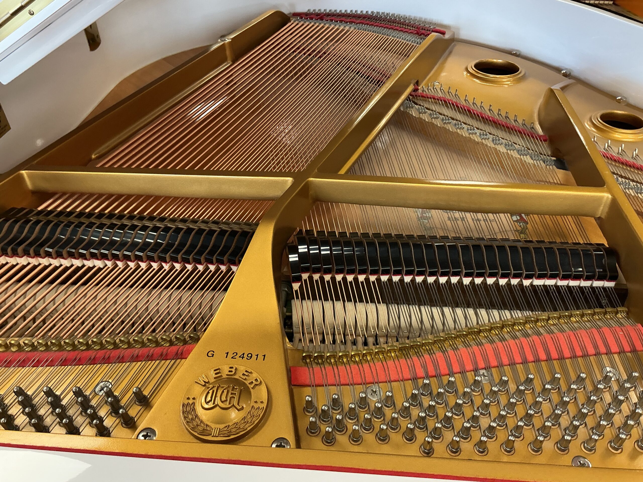 Our Lancaster, PA – Menchey Music Service piano gallery location has just received this gorgeous Weber, Model WG-50 baby grand piano finished in stunning polished white. At 4’11” in length, this instrument will fit into a small space, yet resonates with a full and rich tonal quality. This instrument is in pristine condition and has come to us from a non-smoking local residence. It will provide many years of musical enjoyment for any piano enthusiast from beginning to advanced levels.